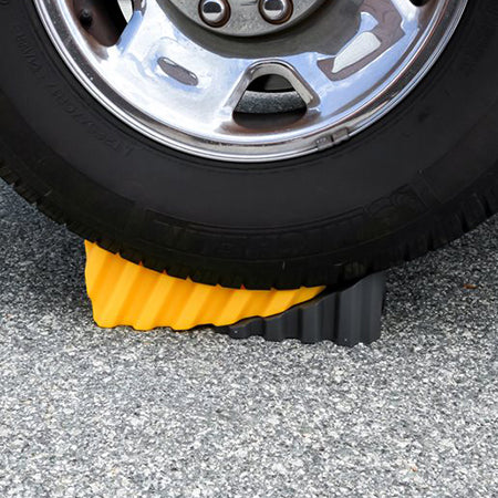 The honeycomb design makes the leveler lightweight but durable. The drive-on curved design allows you to only drive on to as much height as needed, then chock the leveler at the exact right height. The included chock has non-slip rubber grippers on the bottom.